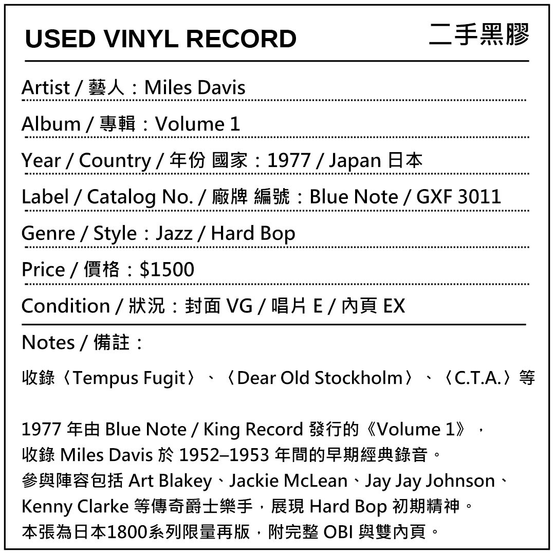 Miles Davis《Volume 1》收錄 1952–1953 年間的重要錄音,陣容包含 Art Blakey、Jackie McLean、Jay Jay Johnson、Kenny Clarke 等傳奇樂手,展現早期 Hard Bop 精神。